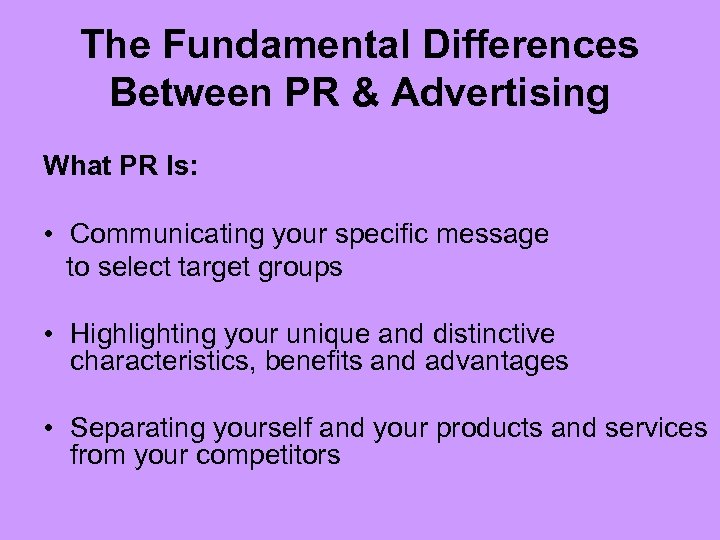 The Fundamental Differences Between PR & Advertising What PR Is: • Communicating your specific message to select target groups • Highlighting your unique and distinctive characteristics, benefits and advantages • Separating yourself and your products and services from your competitors