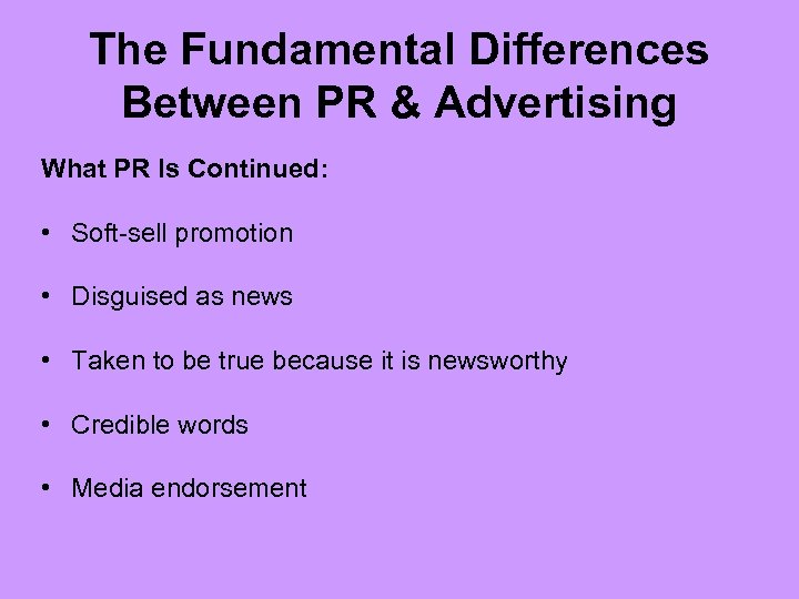 The Fundamental Differences Between PR & Advertising What PR Is Continued: • Soft-sell promotion • Disguised as news • Taken to be true because it is newsworthy • Credible words • Media endorsement
