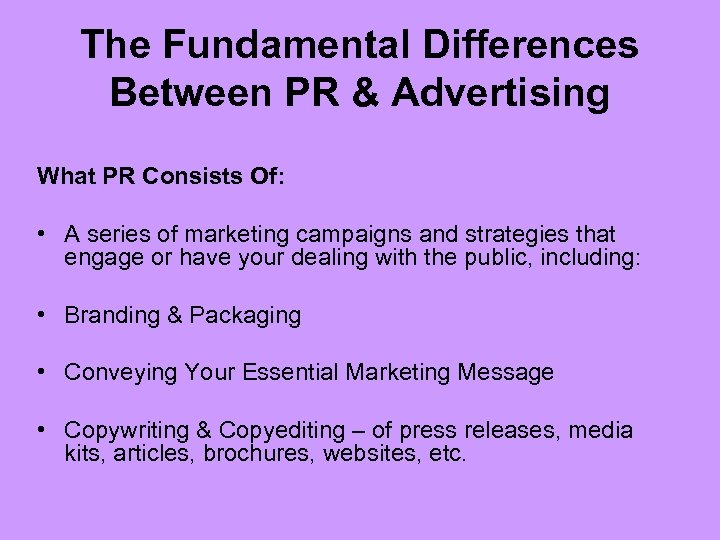 The Fundamental Differences Between PR & Advertising What PR Consists Of: • A series of marketing campaigns and strategies that engage or have your dealing with the public, including: • Branding & Packaging • Conveying Your Essential Marketing Message • Copywriting & Copyediting – of press releases, media kits, articles, brochures, websites, etc.