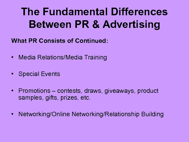 The Fundamental Differences Between PR & Advertising What PR Consists of Continued: • Media Relations/Media Training • Special Events • Promotions – contests, draws, giveaways, product samples, gifts, prizes, etc. • Networking/Online Networking/Relationship Building