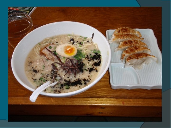 Modern Day Cooking Continued • Strictly Vegetarian foods are rare in Japan since even vegetable dishes have shipjack tuna flakes on them • Though there is an exception on しょうじん り ようり a vegetarian dish created by Japanese monks • Noodles are a very important part of japanese cuisine as an alternative to rice • そば and うどん are the main traditional noodles that can be served either hot or cold, also Chinese-style noodles called らめん , served in meat stock, have become very popular over the past century