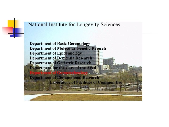 New Era of Institution n n National center of geriatrics and gerontology will be reorganized on March 1 st, 2004 13 departments and 5 facilities