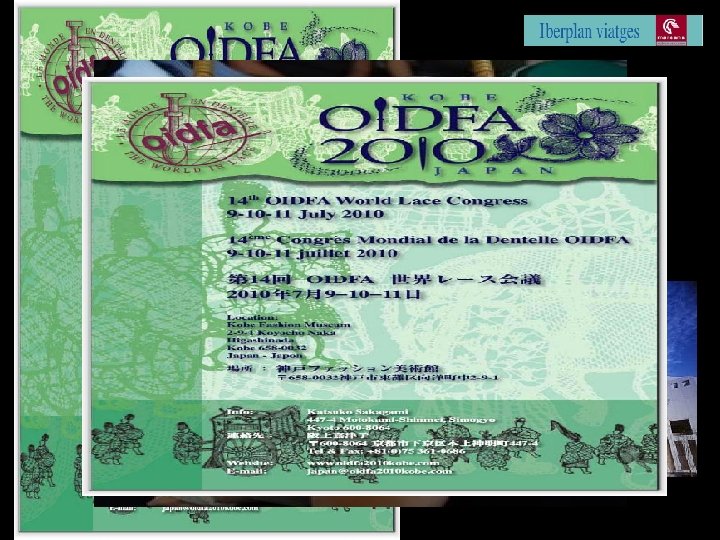 VIAJE EXCLUSIVO JAPÓN – CONGRESO OIDFA 2010 DESCUBRA JAPÓN en un viaje de ensueño exclusivo para personas que comparten la pasión por el ENCAJE DE BOLILLOS. Un viaje para que sólo se tenga que preocupar de DISFRUTAR de las maravillas de Japón , su cultura milenaria y del Bolillo Japonés. Para ello les hemos preparado un VIAJE QUE INCLUYE : -9 días / 8 noches en Media Pensión o pensión Completa (opcional) - Guía acompañante IBERPLAN y Guía Local de habla española DURANTE TODO EL VIAJE - Todas las visitas, excursiones, entradas, traslados en privado según el itinerario - Estancia en Hotels 4* y 5* durante todo el Viaje - CENA DE GALA en KOBE - CONGRESO - Seguro de asistencia en Viaje - Seguro de anulación (opcional)