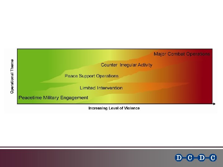 Spectrum of Conflict View Peacetime Military Engagement Limited Intervention Peace Support Operations Counter Irregular Activity Level of violence Major Combat