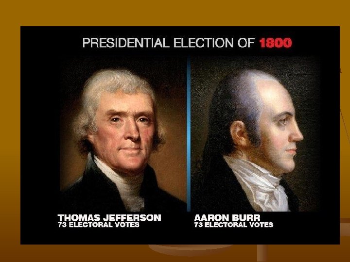 Election of 1800 Jefferson & Burr tie w/ 73 votes. House of Rep. decided who is going to be president. n n n Hamilton controls the outcome—HE CHOSE JEFFERSON TO BE PRESIDENT! 12 th Amendment added to the Constitution to prevent a tie from happening again Electors cast a vote for President & VP, both run together in the same ticket (ballot)! https: //www. youtube. com/watch? v=zd. Nd. G Kvq. TLY