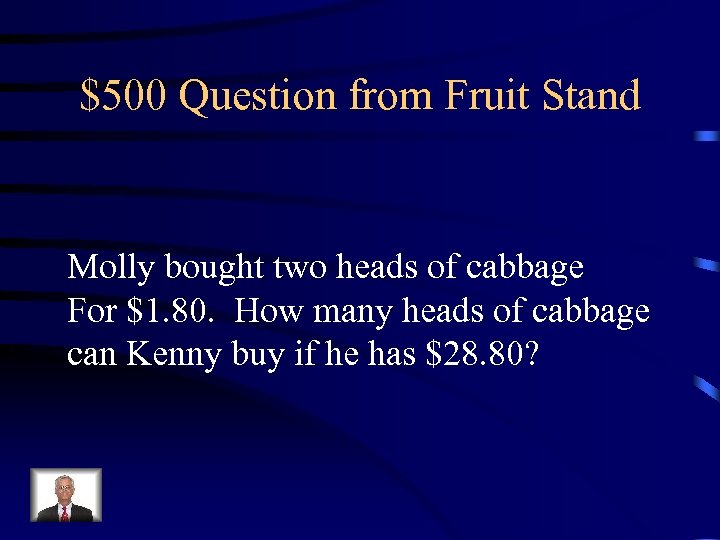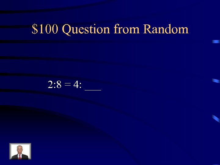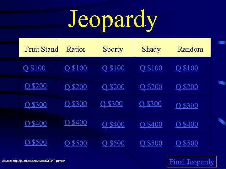 Jeopardy Fruit Stand Ratios Sporty Shady Random Q $100 Q $100 Q $200 Q $200 Q $300 Q $300 Q $400 Q $400 Q $500 Q $500 Source: http: //jc-schools. net/tutorials/PPT-games/ Final Jeopardy