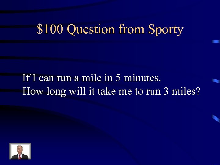 $100 Question from Sporty If I can run a mile in 5 minutes. How long will it take me to run 3 miles?