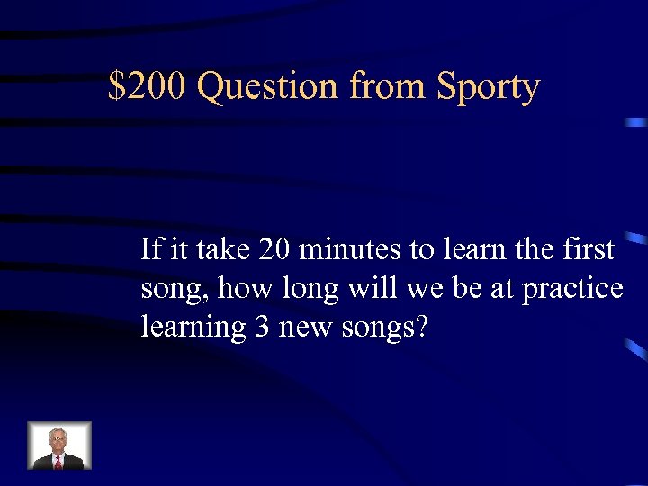 $200 Question from Sporty If it take 20 minutes to learn the first song, how long will we be at practice learning 3 new songs?