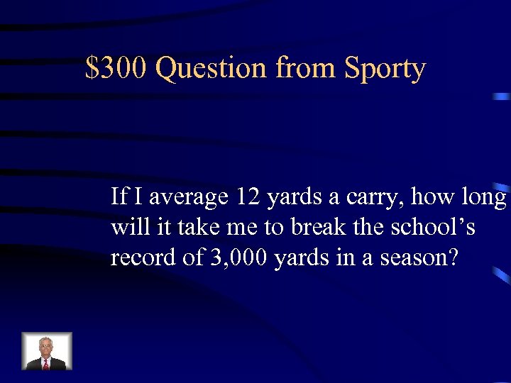 $300 Question from Sporty If I average 12 yards a carry, how long will it take me to break the school’s record of 3, 000 yards in a season?