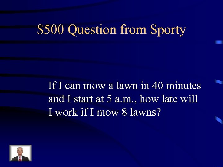$500 Question from Sporty If I can mow a lawn in 40 minutes and I start at 5 a. m. , how late will I work if I mow 8 lawns?