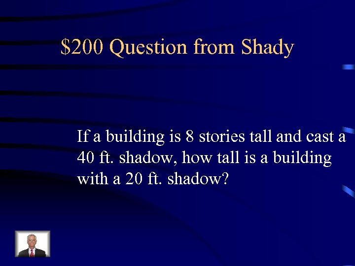 $200 Question from Shady If a building is 8 stories tall and cast a 40 ft. shadow, how tall is a building with a 20 ft. shadow?