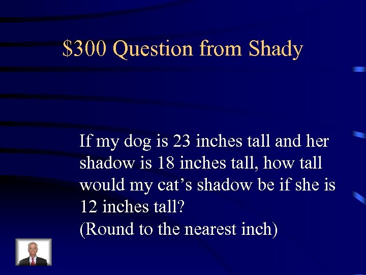 $300 Question from Shady If my dog is 23 inches tall and her shadow is 18 inches tall, how tall would my cat’s shadow be if she is 12 inches tall? (Round to the nearest inch)