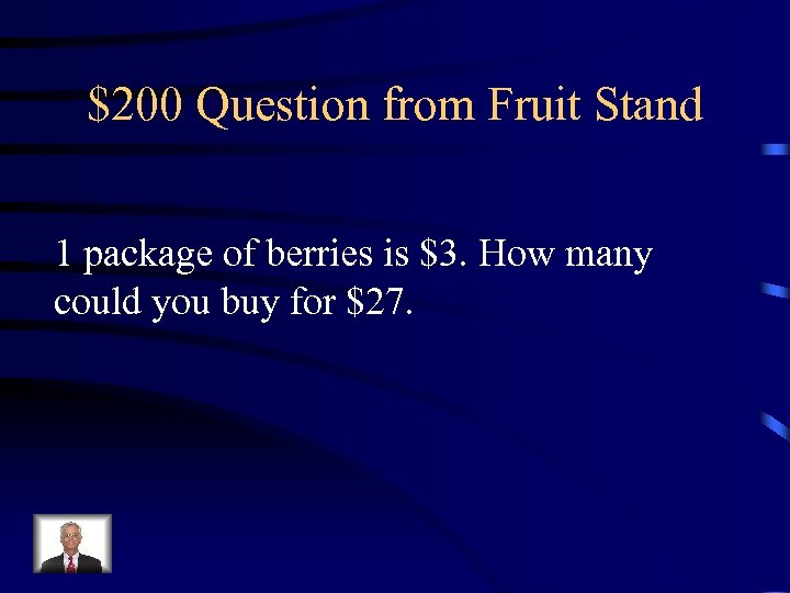 $200 Question from Fruit Stand 1 package of berries is $3. How many could you buy for $27.