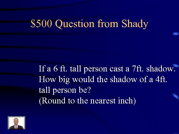 $500 Question from Shady If a 6 ft. tall person cast a 7 ft. shadow. How big would the shadow of a 4 ft. tall person be? (Round to the nearest inch)