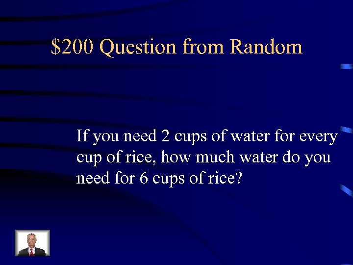 $200 Question from Random If you need 2 cups of water for every cup of rice, how much water do you need for 6 cups of rice?