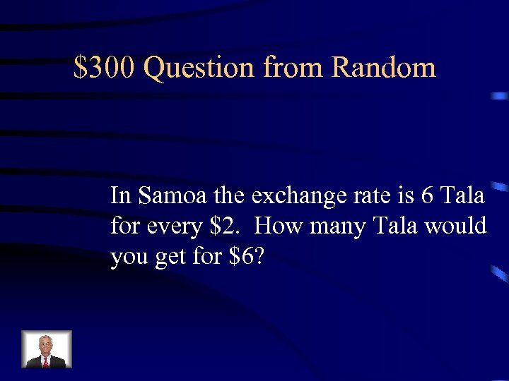 $300 Question from Random In Samoa the exchange rate is 6 Tala for every $2. How many Tala would you get for $6?