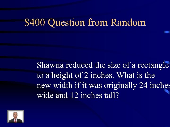 $400 Question from Random Shawna reduced the size of a rectangle to a height of 2 inches. What is the new width if it was originally 24 inches wide and 12 inches tall?
