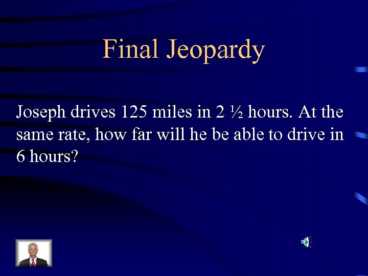 Final Jeopardy Joseph drives 125 miles in 2 ½ hours. At the same rate, how far will he be able to drive in 6 hours?