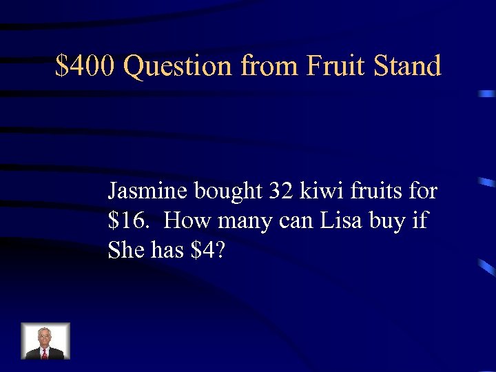 $400 Question from Fruit Stand Jasmine bought 32 kiwi fruits for $16. How many can Lisa buy if She has $4?
