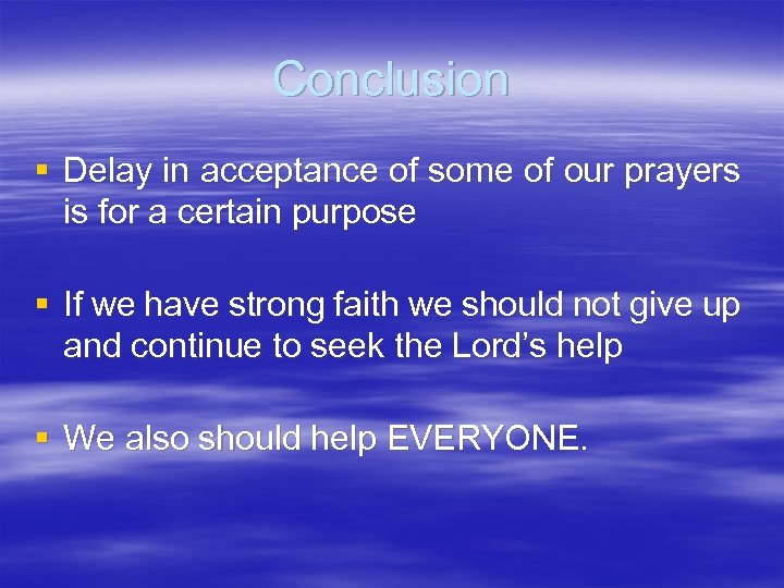 Conclusion § Delay in acceptance of some of our prayers is for a certain purpose § If we have strong faith we should not give up and continue to seek the Lord’s help § We also should help EVERYONE.