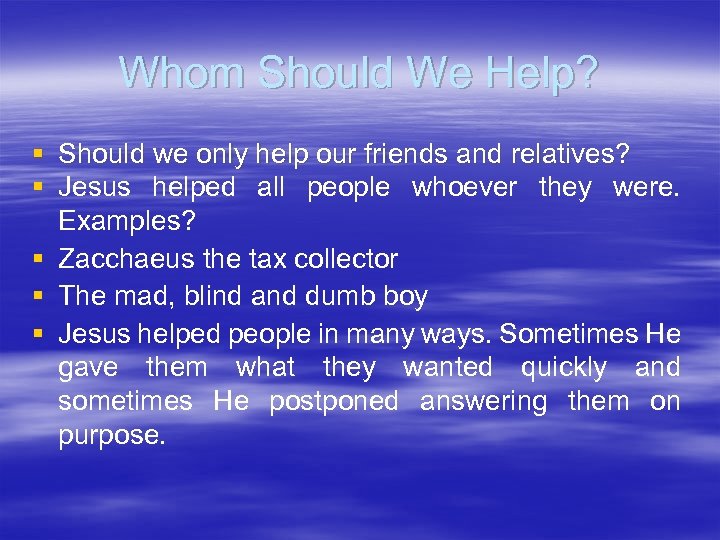 Whom Should We Help? § Should we only help our friends and relatives? § Jesus helped all people whoever they were. Examples? § Zacchaeus the tax collector § The mad, blind and dumb boy § Jesus helped people in many ways. Sometimes He gave them what they wanted quickly and sometimes He postponed answering them on purpose.