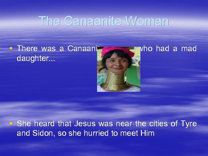 The Canaanite Woman § There was a Canaanite woman who had a mad daughter. . . § She heard that Jesus was near the cities of Tyre and Sidon, so she hurried to meet Him