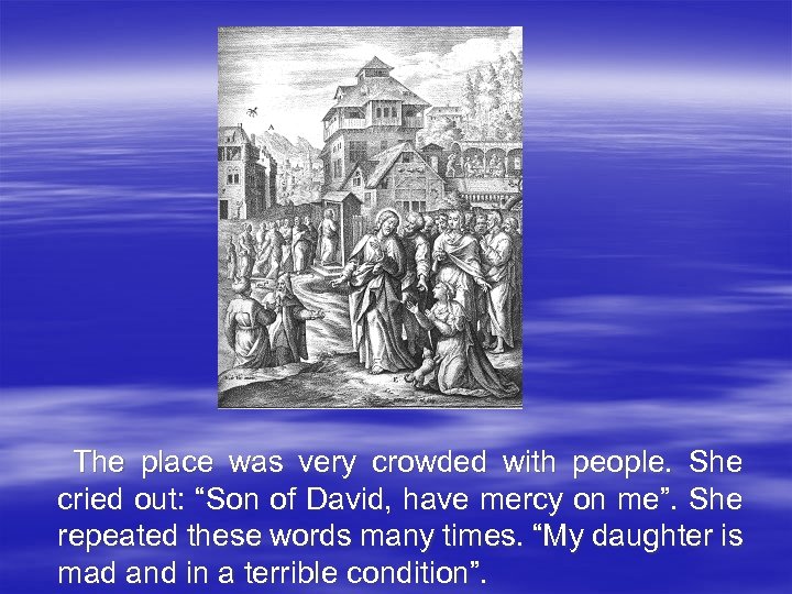 The place was very crowded with people. She cried out: “Son of David, have mercy on me”. She repeated these words many times. “My daughter is mad and in a terrible condition”.