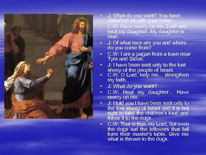 § J: What do you want? You have disturbed us with your noise. § C. W: Have mercy on me, Lord and heal my daughter. My daughter is mad. § J: Of what race are you and where do you come from? § C. W: I am a pagan from a town near Tyre and Sidon. § J: I have been sent only to the lost sheep of the people of Israel. § C. W: O Lord, help me. . . strengthen my faith. § J: What do you want? § C. W: Heal my daughter. . . Have mercy on me. § J: I told you I have been sent only to the lost sheep of Israel and it is not right to take the children’s food and throw it to the dogs. § C. W: That is true, my Lord, but even the dogs eat the leftovers that fall form their master’s table. Give me what is thrown to the dogs.