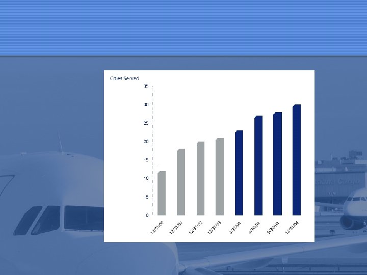 Strategy • “Our goal is to establish jet. Blue as a leading lowfare, low-cost passenger airline by offering customers high-quality customer service and a differentiated product. We strive to offer low fares that stimulate market demand while maintaining a continuous focus on cost-containment and operating efficiencies. We intend to follow a controlled growth plan designed to take advantage of our competitive strengths. Our growth has occurred, and we believe it will continue to occur, by adding additional frequencies on existing routes, connecting new city pairs among the destinations we already serve and entering new markets often served by higher-cost, higher-fare airlines. ”