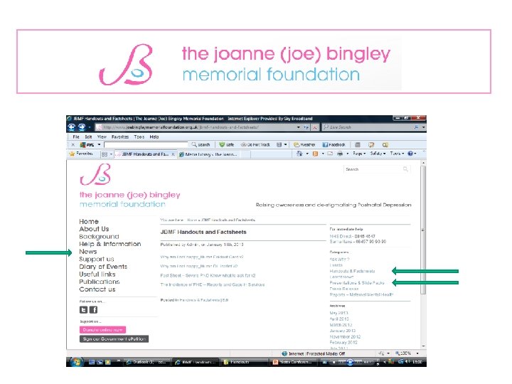 JBMF – How we help How the foundation delivers it’s aims: • Website and information leaflets provide information on what you need to know so dads, grandparents and friends can help. • We publish stories in national media, Twitter, Facebook and our website to encourage open discussion and raise awareness • Knowledge of ‘Best practice’ – legislation, care quality protocols, befriender and peer support groups, self help, supervision, etc; presenting at seminars and workshops to inform commissioners, dept health, parliament, etc. on patient and service issues. • We provide training/education workshops for support &care workers • We have supported research including: • The Patients Association survey of Primary Care Trusts • Kings College User Group • Through the establishment of the Maternal Mental Health Alliance we aim to inform parliament and NHS policy makers.