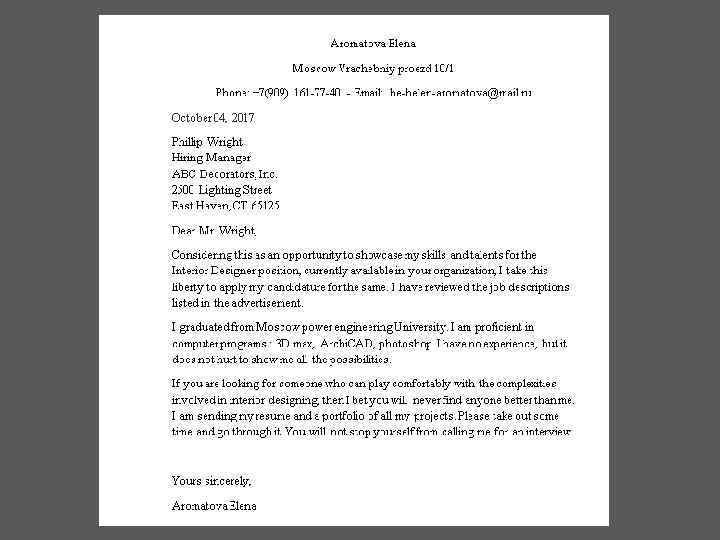 Instructions to write an interior designer cover letter • A cover letter should always start with your contact details, date of writing, and the receivers information such as name, title and address. • The first paragraph should inform the readers on how you came to know about the job opening. If it is an unsolicited letter, then describe something about the company that made you to apply. Be particular when distinguishing the position you are interested in. • Be precise and relate your skills and experiences to the employers needs. State the projects you have handled. Mention about your interior-design qualifications and internship you have done. • Try to appeal to the reader with the look of your cover by applying your designing Let the readers see that you have applied your planning skills in writing the cover letter.
