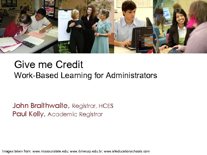 John Braithwaite, Registrar, School of Health, Community and Education Studies Paul Kelly, Academic Registrar Give me Credit Work-Based Learning for Administrators John Braithwaite, Registrar, HCES Paul Kelly, Academic Registrar Images taken from: www. missouristate. edu; www. ibmecsp. edu. br; www. alleducationschools. com