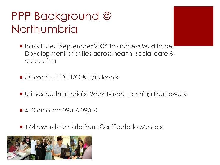 PPP Background @ Northumbria ¡ Introduced September 2006 to address Workforce Development priorities across health, social care & education ¡ Offered at FD, U/G & P/G levels. ¡ Utilises Northumbria’s Work-Based Learning Framework ¡ 400 enrolled 09/06 -09/08 ¡ 144 awards to date from Certificate to Masters