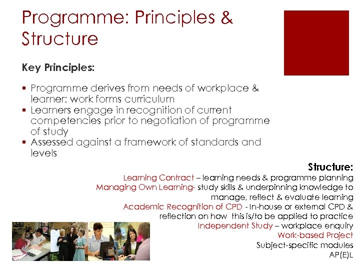 Programme: Principles & Structure Key Principles: § Programme derives from needs of workplace & learner: work forms curriculum § Learners engage in recognition of current competencies prior to negotiation of programme of study § Assessed against a framework of standards and levels Structure: Learning Contract – learning needs & programme planning Managing Own Learning- study skills & underpinning knowledge to manage, reflect & evaluate learning Academic Recognition of CPD - In-house or external CPD & reflection on how this is/to be applied to practice Independent Study – workplace enquiry Work-based Project Subject-specific modules AP(E)L