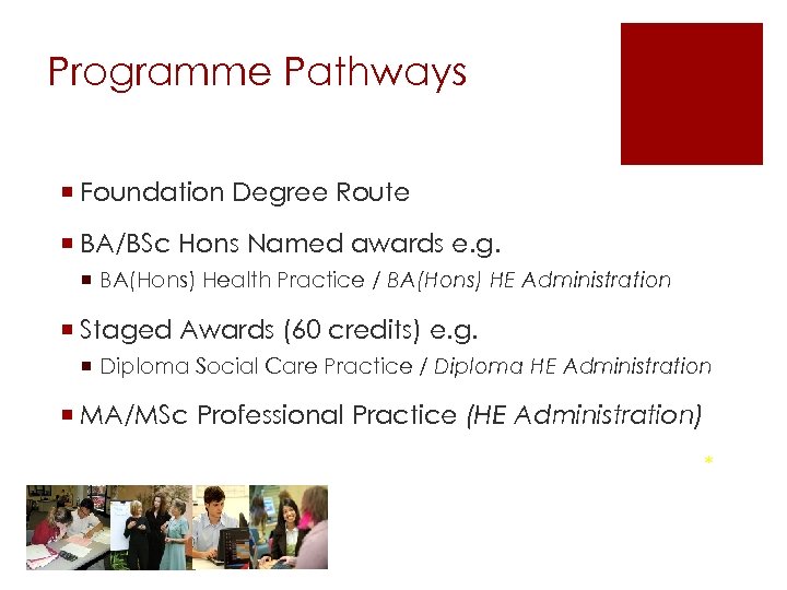 Programme Pathways ¡ Foundation Degree Route ¡ BA/BSc Hons Named awards e. g. ¡ BA(Hons) Health Practice / BA(Hons) HE Administration ¡ Staged Awards (60 credits) e. g. ¡ Diploma Social Care Practice / Diploma HE Administration ¡ MA/MSc Professional Practice (HE Administration) *