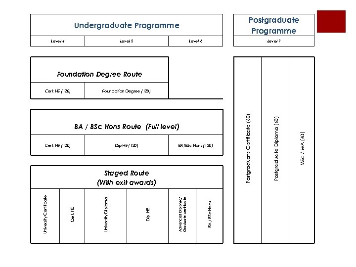 Postgraduate Programme Undergraduate Programme Level 4 Level 5 Level 6 Level 7 Foundation Degree Route Cert. HE (120) Dip HE (120) BA/BSc Hons (120) BA / BSc Hons Advanced Diploma/ Graduate certificate Dip. HE University Diploma Cert. HE University Certificate Staged Route (With exit awards) MSc / MA (60) BA / BSc Hons Route (Full level) Postgraduate Diploma (60) Foundation Degree (120) Postgraduate Certificate (60) Cert. HE (120)