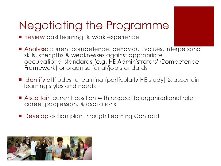 Negotiating the Programme ¡ Review past learning & work experience ¡ Analyse: current competence, behaviour, values, interpersonal skills, strengths & weaknesses against appropriate occupational standards (e. g. HE Administrators’ Competence Framework) or organisational/job standards ¡ Identify attitudes to learning (particularly HE study) & ascertain learning styles and needs ¡ Ascertain current position with respect to organisational role; career progression, & aspirations ¡ Develop action plan through Learning Contract