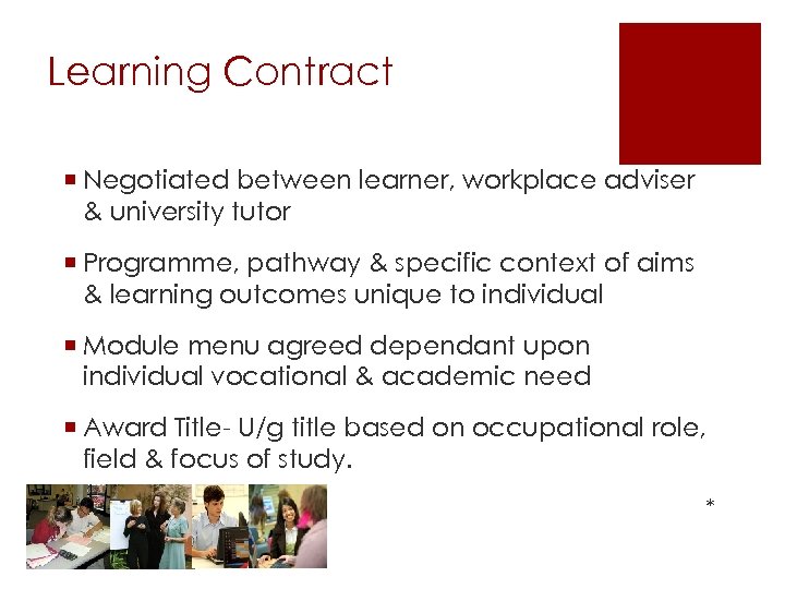 Learning Contract ¡ Negotiated between learner, workplace adviser & university tutor ¡ Programme, pathway & specific context of aims & learning outcomes unique to individual ¡ Module menu agreed dependant upon individual vocational & academic need ¡ Award Title- U/g title based on occupational role, field & focus of study. *