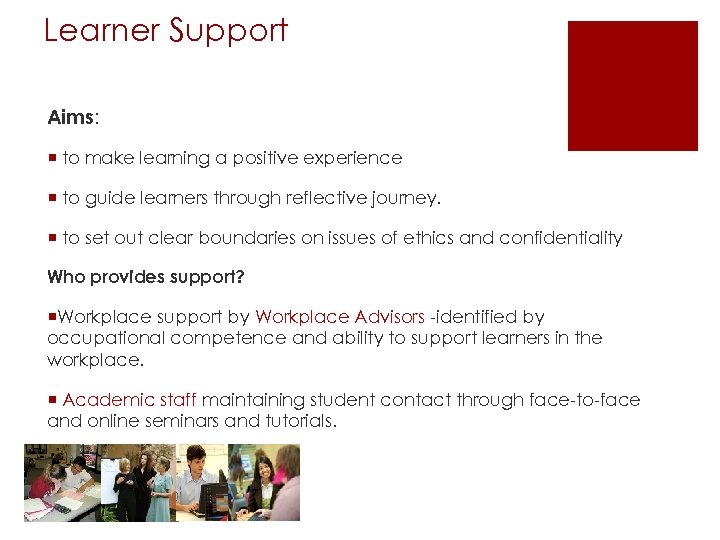 Learner Support Aims: ¡ to make learning a positive experience ¡ to guide learners through reflective journey. ¡ to set out clear boundaries on issues of ethics and confidentiality Who provides support? ¡Workplace support by Workplace Advisors -identified by occupational competence and ability to support learners in the workplace. ¡ Academic staff maintaining student contact through face-to-face and online seminars and tutorials.