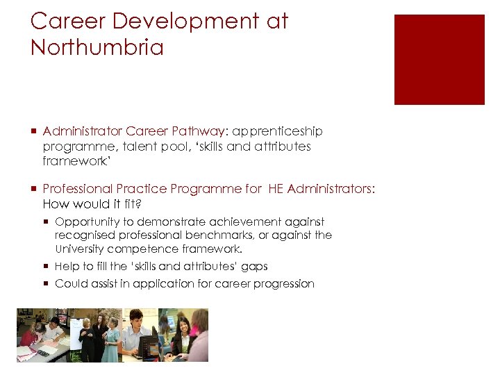 Career Development at Northumbria ¡ Administrator Career Pathway: apprenticeship programme, talent pool, ‘skills and attributes framework’ ¡ Professional Practice Programme for HE Administrators: How would it fit? ¡ Opportunity to demonstrate achievement against recognised professional benchmarks, or against the University competence framework. ¡ Help to fill the ‘skills and attributes’ gaps ¡ Could assist in application for career progression