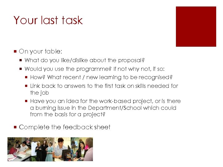 Your last task ¡ On your table: ¡ What do you like/dislike about the proposal? ¡ Would you use the programme? If not why not, if so: ¡ How? What recent / new learning to be recognised? ¡ Link back to answers to the first task on skills needed for the job ¡ Have you an idea for the work-based project, or is there a burning issue in the Department/School which could from the basis for a project? ¡ Complete the feedback sheet