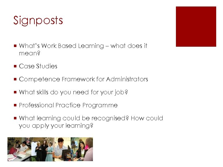Signposts ¡ What’s Work Based Learning – what does it mean? ¡ Case Studies ¡ Competence Framework for Administrators ¡ What skills do you need for your job? ¡ Professional Practice Programme ¡ What learning could be recognised? How could you apply your learning?