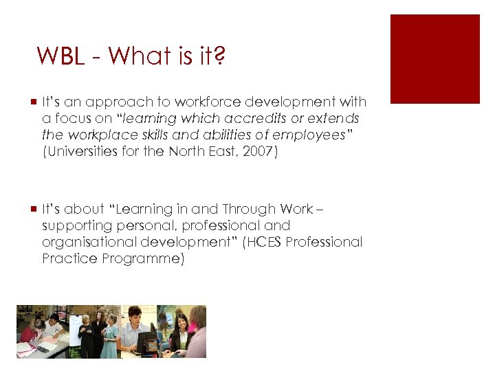 WBL - What is it? ¡ It’s an approach to workforce development with a focus on “learning which accredits or extends the workplace skills and abilities of employees” (Universities for the North East, 2007) ¡ It’s about “Learning in and Through Work – supporting personal, professional and organisational development” (HCES Professional Practice Programme)