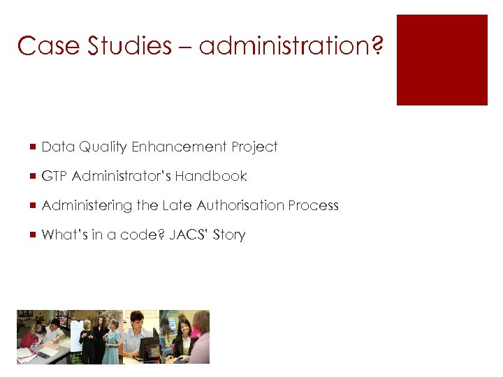 Case Studies – administration? ¡ Data Quality Enhancement Project ¡ GTP Administrator’s Handbook ¡ Administering the Late Authorisation Process ¡ What’s in a code? JACS’ Story
