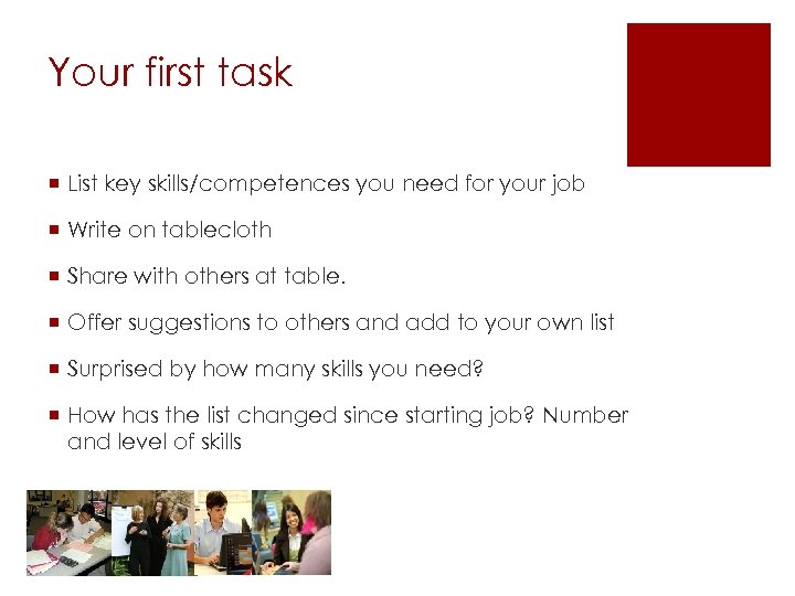 Your first task ¡ List key skills/competences you need for your job ¡ Write on tablecloth ¡ Share with others at table. ¡ Offer suggestions to others and add to your own list ¡ Surprised by how many skills you need? ¡ How has the list changed since starting job? Number and level of skills