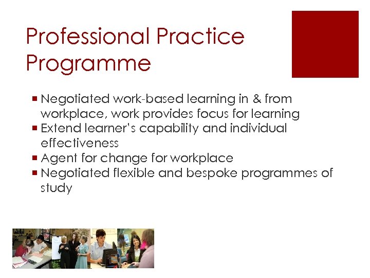 Professional Practice Programme ¡ Negotiated work-based learning in & from workplace, work provides focus for learning ¡ Extend learner’s capability and individual effectiveness ¡ Agent for change for workplace ¡ Negotiated flexible and bespoke programmes of study