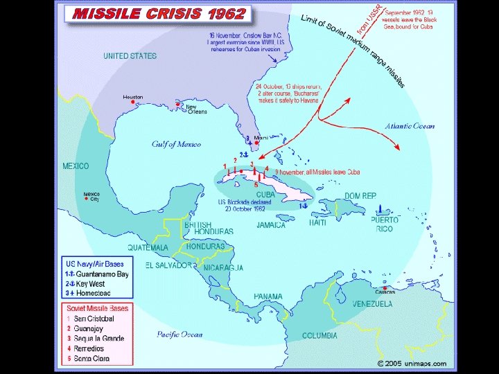 The Cuban Missile Crisis • Stop and go negotiations w/Soviets. • Khrushchev eventually backs down, stops ships b/f quarantine line. • JFK looks like a hero, Khrushchev looks bad to Soviets. • Reality-deal made b/t US and USSR-Khrushchev pulls missiles out of Cuba, US pulls missiles out of Turkey. Khrushchev let Kennedy save face • potential for nuclear holocaust? • Installation of “hot line” (red phone) • Halt atmospheric testing • U. S. , Soviets and Britain begin talks about limiting nuclear tests