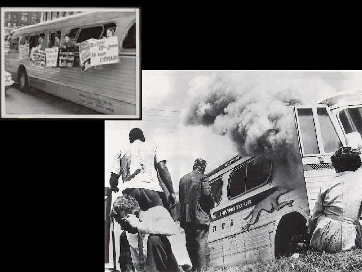 Civil Rights during the Kennedy administration • Initiated by the common people, who weren’t willing to wait any longer. • May 1961 -“Freedom Riders” • test discrimination against interstate travel, desegregate bus stations, etc… • Met with violence, bus set on fire in Alabama, effort continued, 1, 000 “riders”, black and white by the end of summer