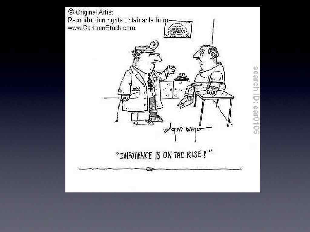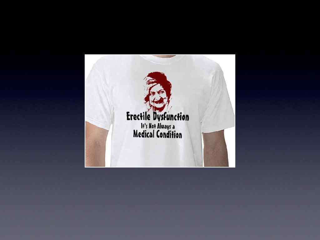 Treatment: Meds: Viagra (Sildenafil) / Levitra (Vardenafil) / Cialis (Todalafil) Inhibits Phosphodiesterase 5 This increases blood flow Testosterone replacement Caverject / suppositories Prosthesis / Vascular surgery Psychology for psychogenic