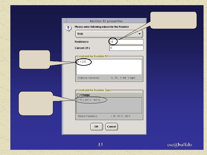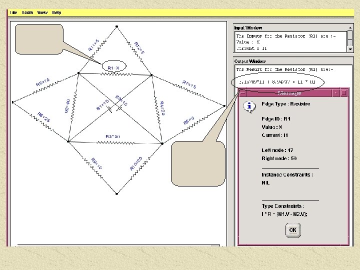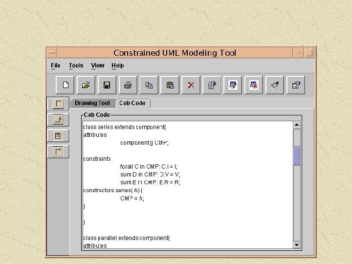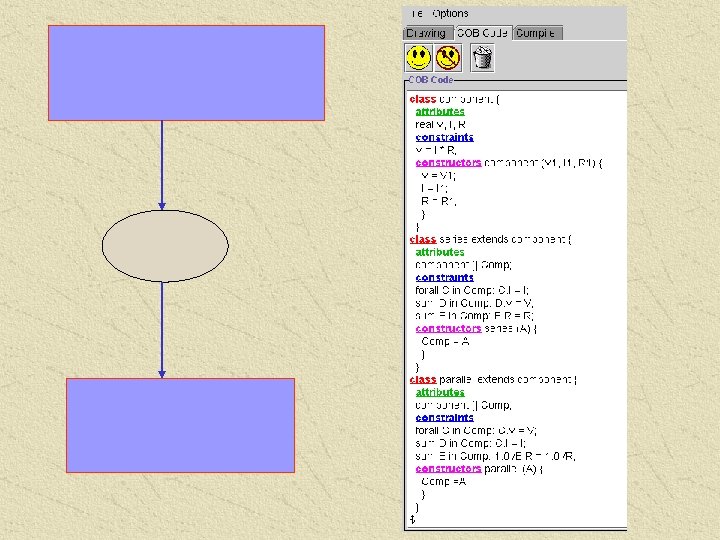 class component { attributes Ohm’s Law Real V, I, R; constraints V = I * R; constructor component(V 1, I 1, R 1) { V = V 1; I = I 1; R = R 1; } } class parallel extends compone { attributes component [ ] C; constraints forall X in C: (X. V = V); (sum X in C: X. I) = I; (sum X in C: 1/X. R) = 1/R; constructor parallel(P) { C = P; }}